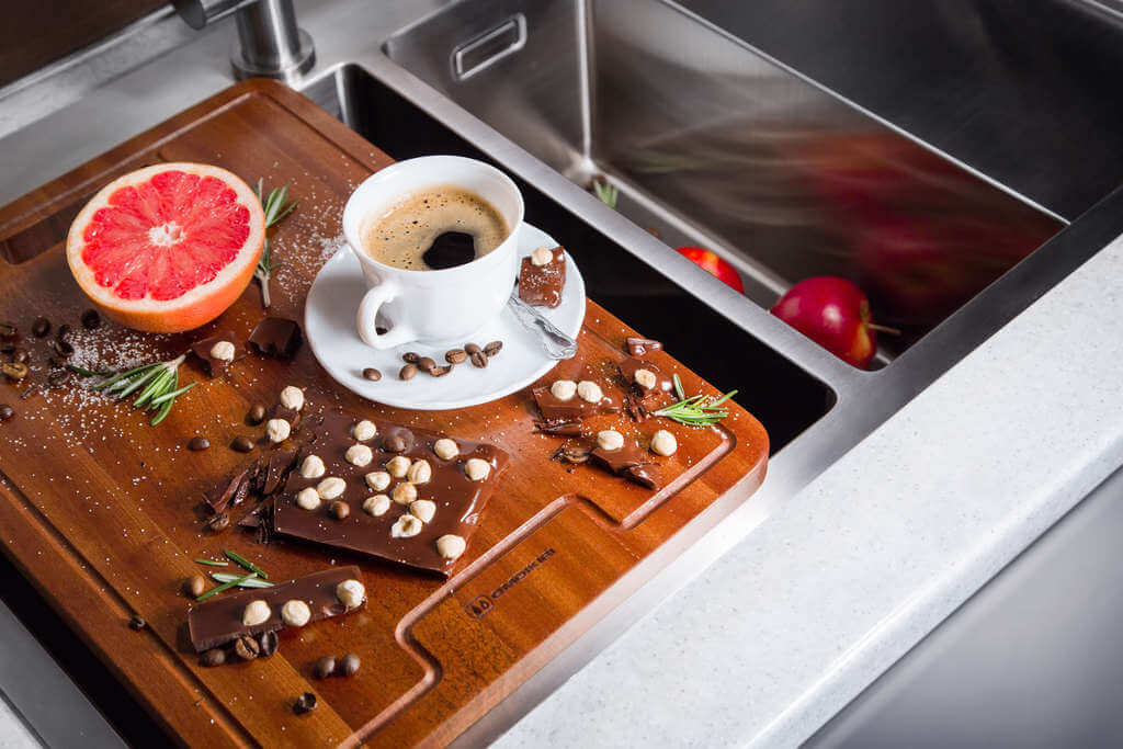 Доска устанавливается на чашу мойки или на ее крыло, создавая дополнительную площадь для работы