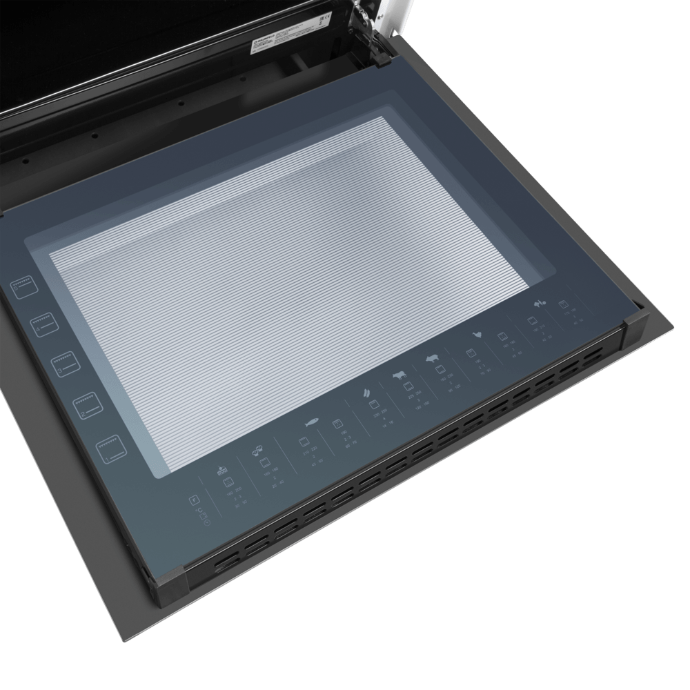 В комплекте: стандартный противень, никелированная решетка духовки, ящик для хранения посуды, прихват