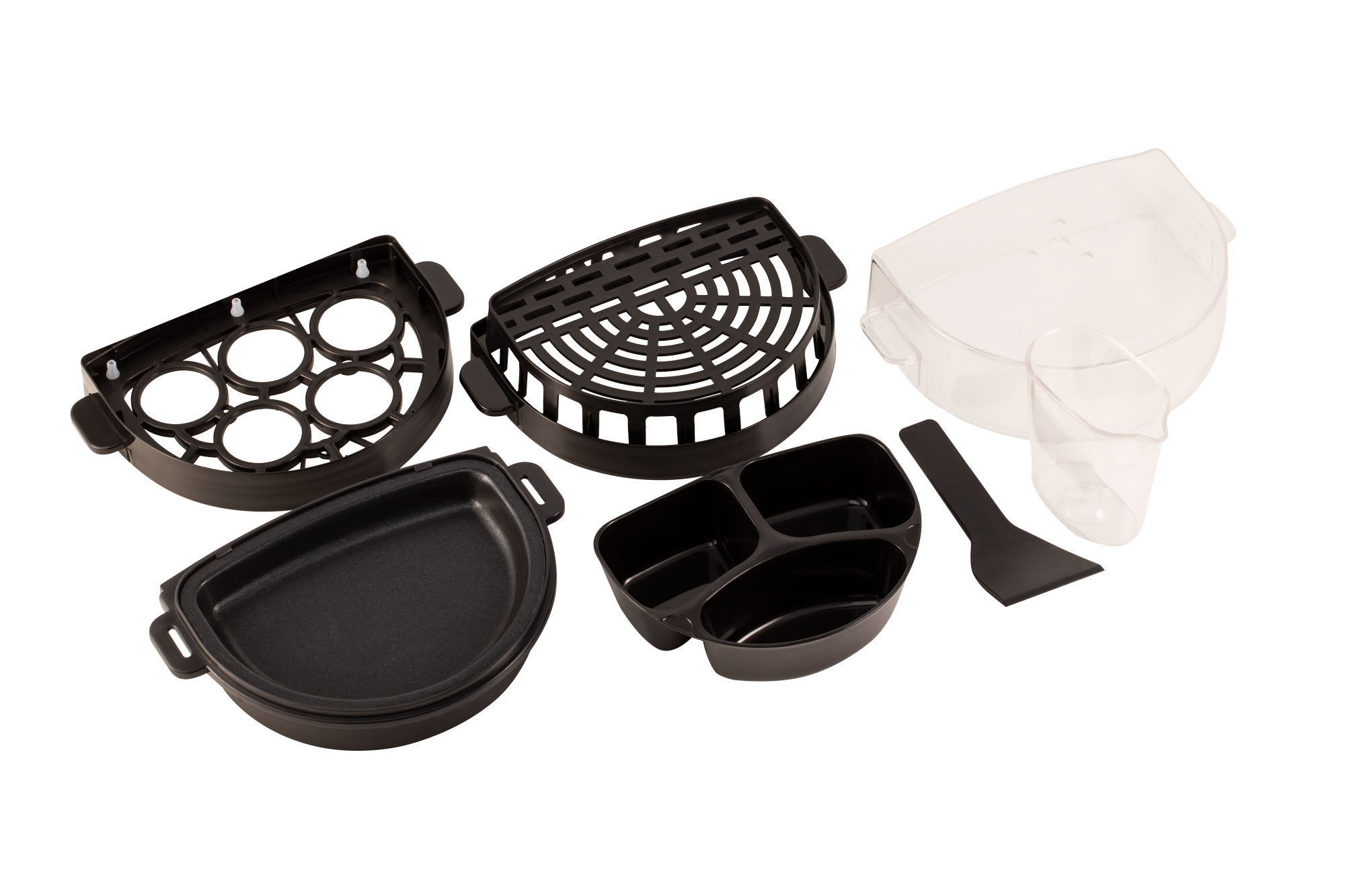 В комплекте: поддон для сбора крошек, лоток для варки яиц, лоток для приготовления на пару, лоток для яичницы, мерный стаканчик