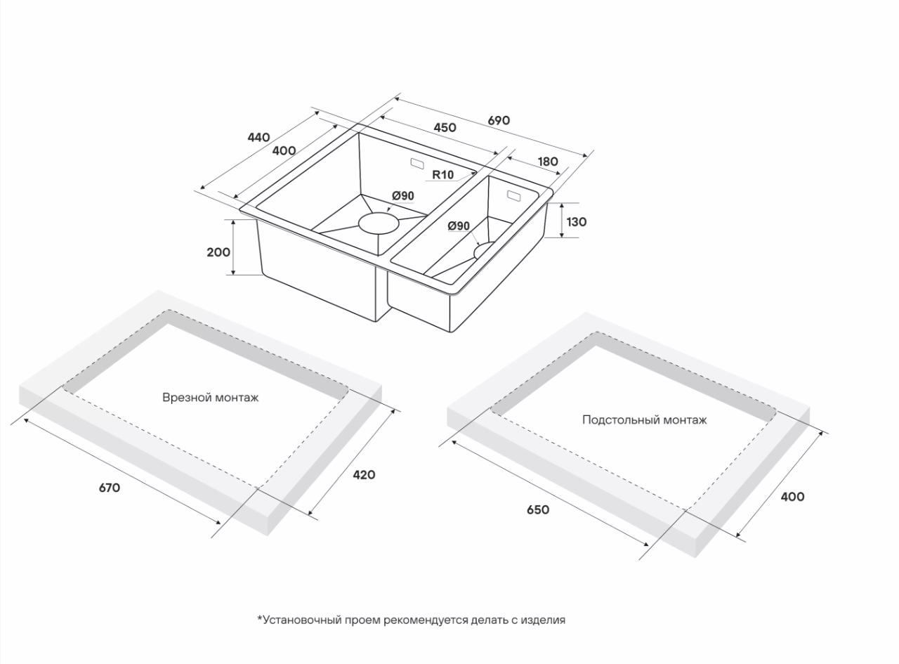 Монтажная длина х ширина (врезной / подстольный): 420х670 / 400х650 мм