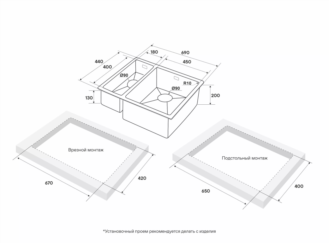 Монтажная длина х ширина (врезной / подстольный): 420х670 / 400х650 мм